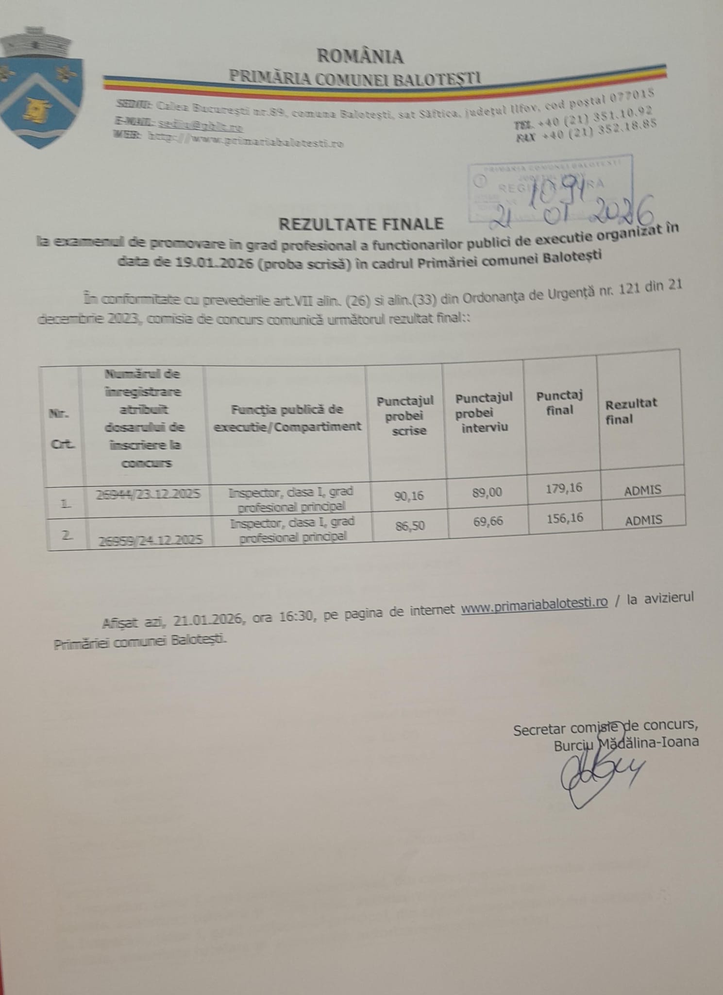 – Rezultate interviu - Anunt concurs – politist local clasa III- 10.02.2025